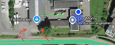 Bei der Einfahrt zum Färbiladen (rote Pfeile) einfahren und dann zum rechten Gebäude.